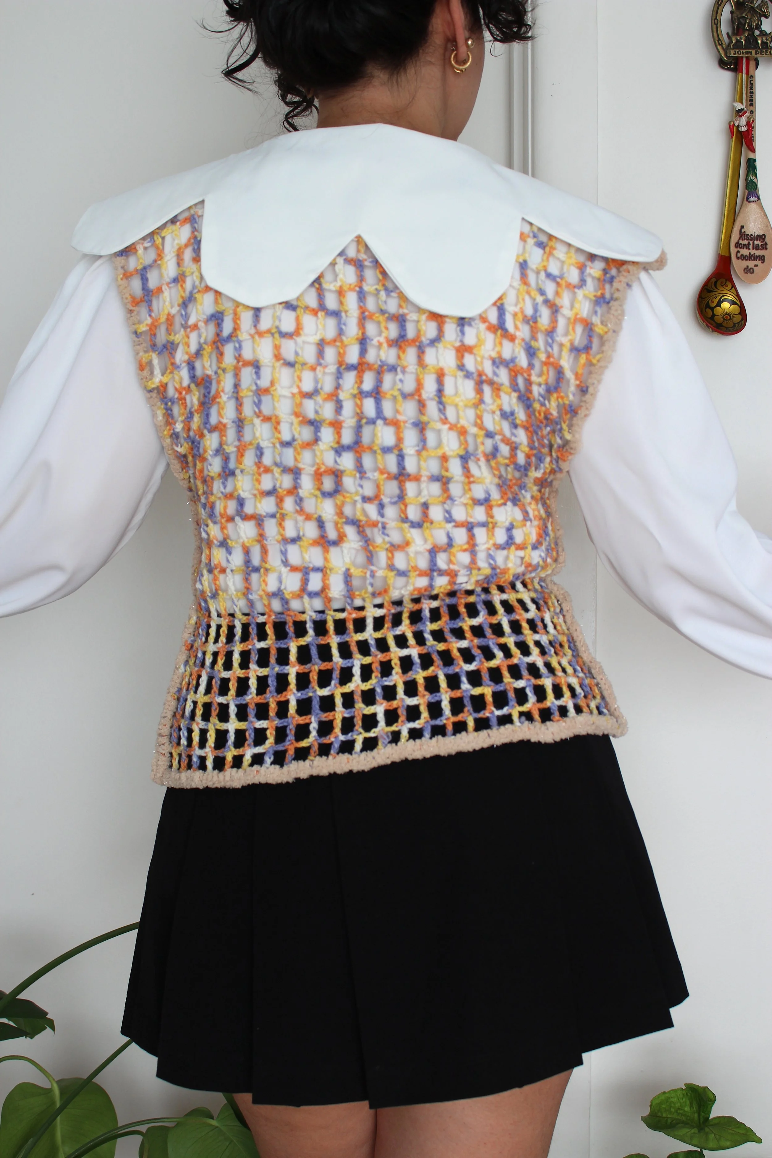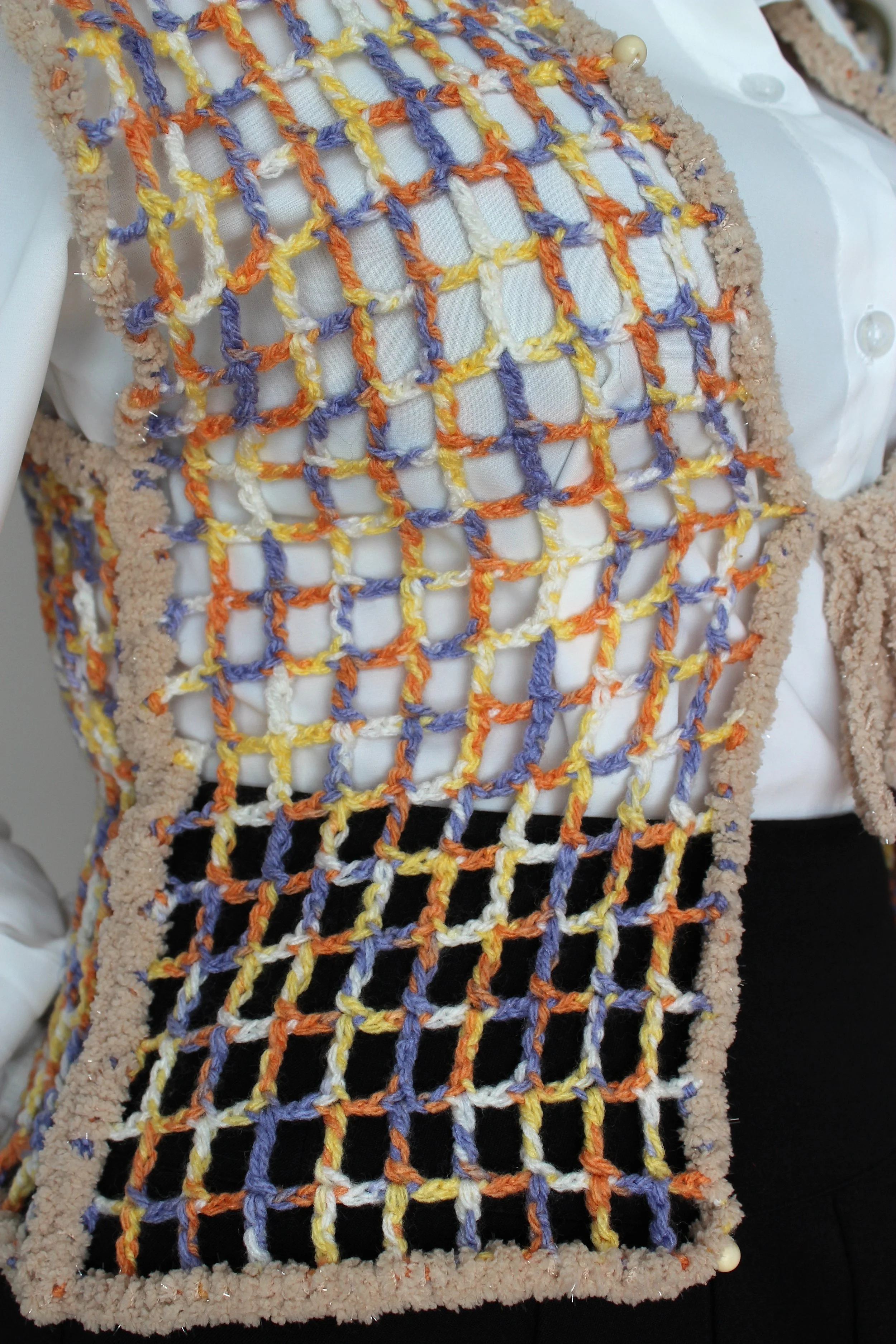 This vest is made of synthetic yarn and plastic beads.